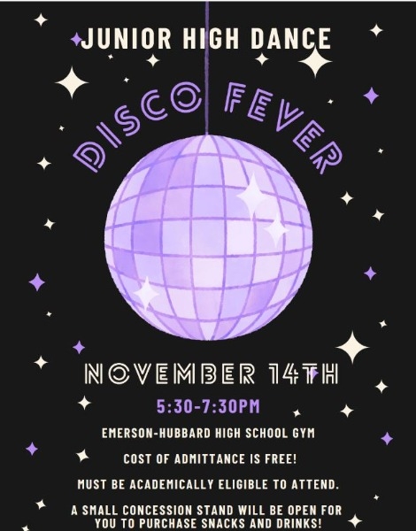 Wolfpack "Disco Fever" Junior High Dance will be held on Friday, November 14th at the Emerson-Hubbard High School Gym from 5:30-7:30 P.M. The dance is open to Emerson-Hubbard MS and Allen JH Students. Admission is FREE! A small concession stand will be open for students to purchase snacks and drinks.