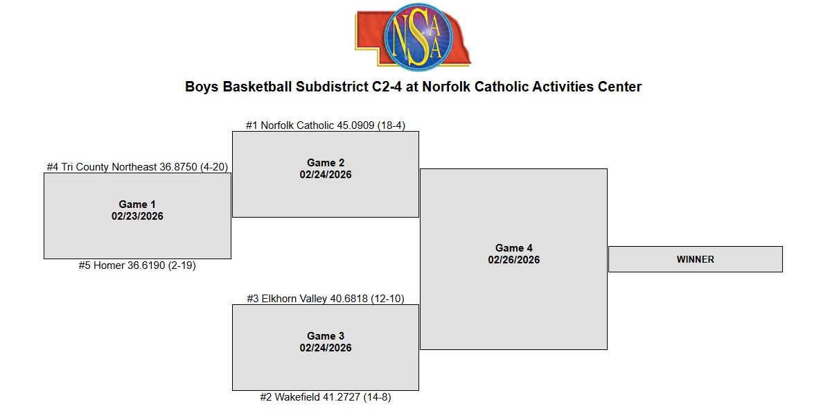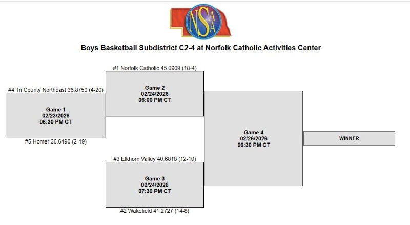 #4 TCNE will play #5 Homer on Monday, February 23rd @ 6:30 P.M. at the Norfolk Catholic Activities Center.